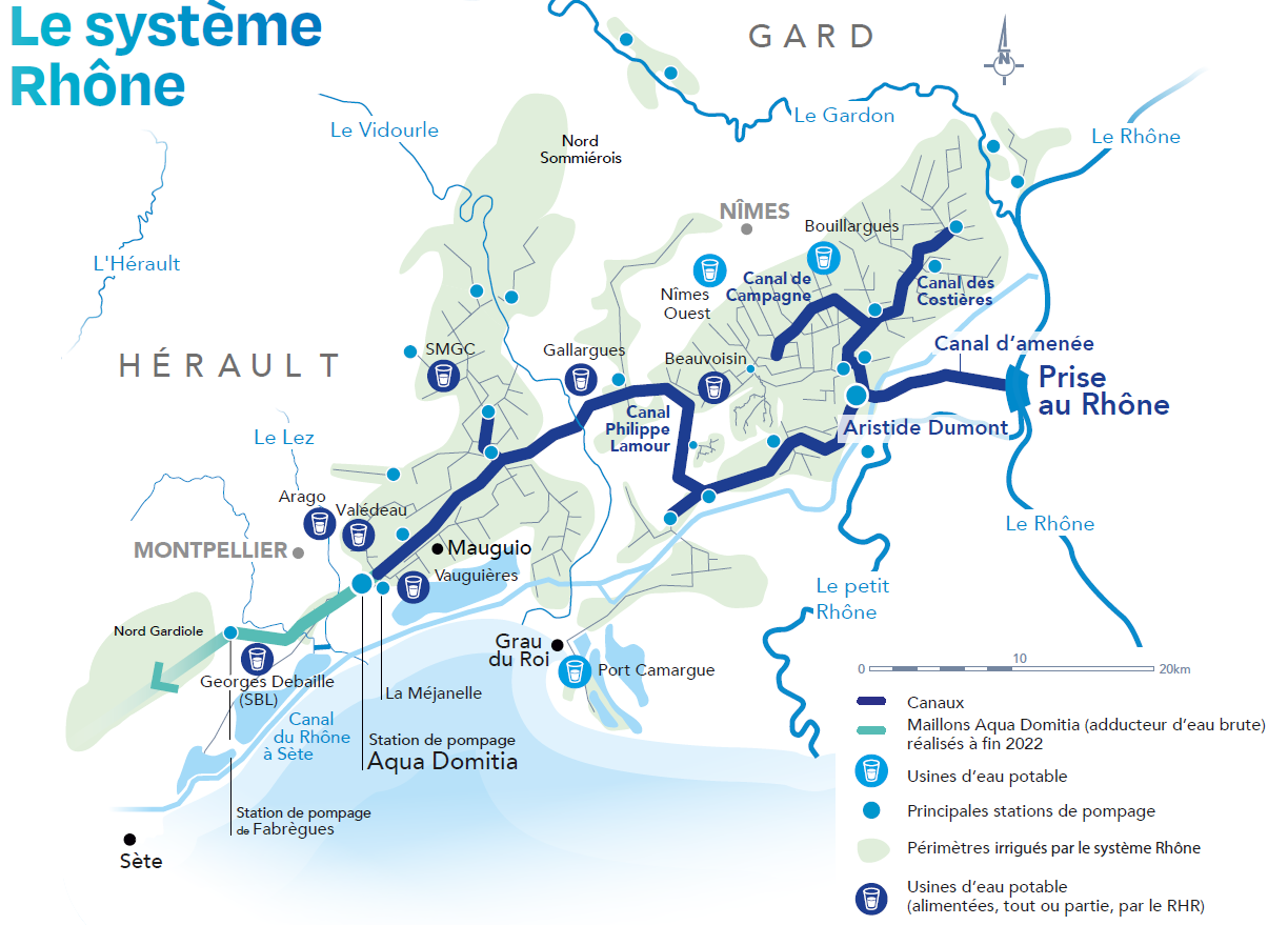 Le Réseau Hydraulique Régional mobilise l'eau du Rhône pour irriguer près de 17 000 ha agricoles. Il a contribué au développement des exploitations de fruits et légumes des Costières, du plateau de Garons et de la plaine de Mauguio et dessert un vaste périmètre viticole dans le Nord Sommiérois. Avec Aqua Domitia, l'eau du Rhône alimente également, depuis 2016, de nouveaux périmètres viticoles dans le Nord Gardiole. A l'issue de la jonction des Maillons centraux d'Aqua Domitia, en 2022, le Rhône permet d'irriguer la plupart des nouveaux périmètres entre Montpellier et Béziers : une extension du périmètre de la commune de Villeveyrac, une extension du RHR sur le nord est biterrois et la substitution d'une partie des volumes prélevés dans le Canal du Midi par la station de Portiragnes.
